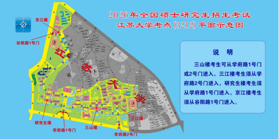 三山楼考生可从学府路1号门或2号门进入,三江楼考生可从学府路2号门进入,研究生楼考生可从学府路1号门进入,京江楼考生可从谷阳路1号门进入。因各楼栋距离较远,请考生务必选择好入校大门。